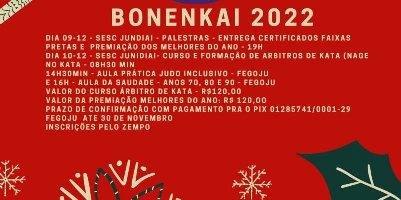 Todos os atletas que se classificaram em primeiro lugar em suas categorias de peso e classe terão direito a receber e participar do Bonenkai 2022 - FEGOJU, conforme a s ... (Ver mais) [1032]